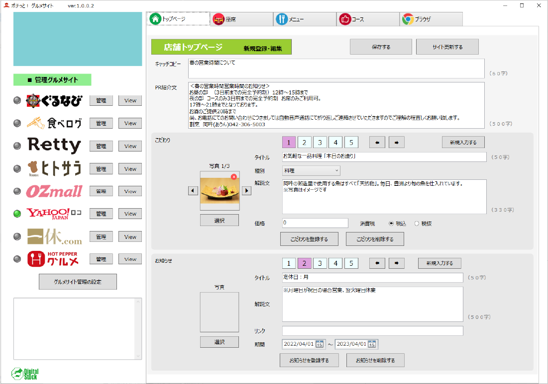 複数のグルメサイト、管理画面から編集したい項目の内容が、「ポチッと!」ボタンで一発編集できます!集客には欠かせないグルメサイト、時節柄の更新で新しい情報を掲載したい!更新作業には時間や手間がかかりますよね。そこで一発編集!『ポチッと!グルメサイト』ソフトが出来ました。